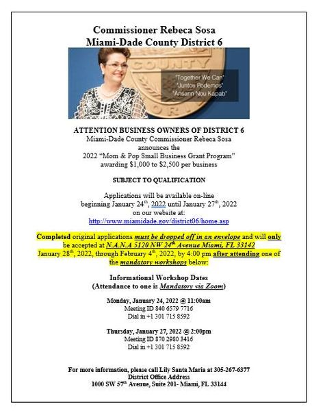 The Mom and Pop Business Grant Program for 2022 applications will be open from January 24th to January 27th. Click here for more information https://www.miamidade.gov/.../commis.../district06/home.page …pic.twitter.com/EIzK1Paw7q