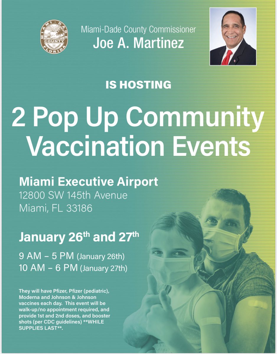 #SaveTheDate! Join the#District11Family on January 26-27, 2021, at#MiamiExecutiveAirport for our#PopUpCommunityVaccinationEvent! Please keep in mind that vaccinations will be distributed until supplies are exhausted.#MiamiDadeCounty#District11pic.twitter.com/GQe84D5zpj