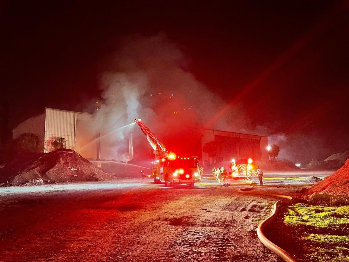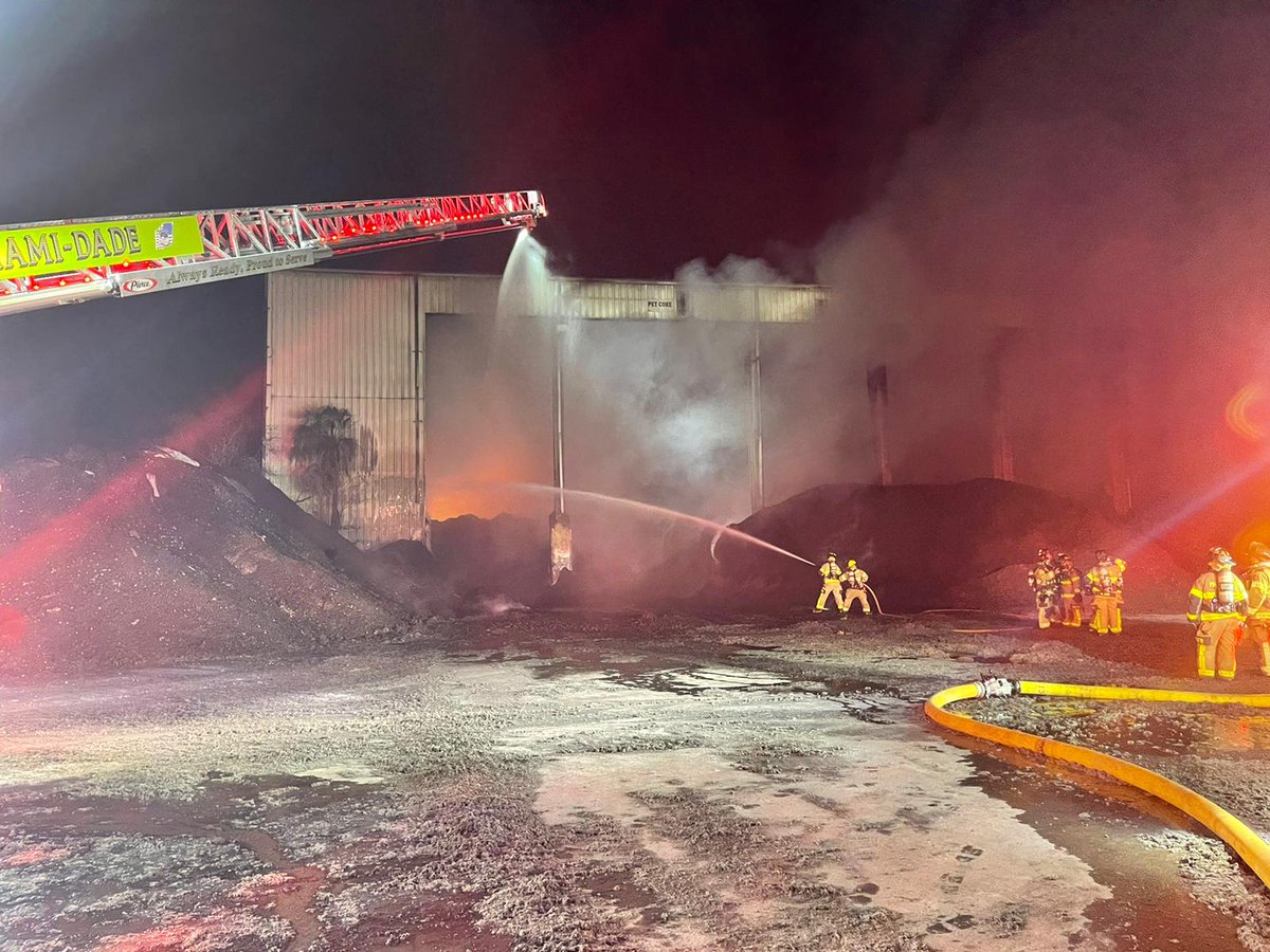 #MDFR responded to a#FirstAlarm fire at 1200 NW 137 Ave. Crews arrived to a large column of smoke coming from the back of the plant & a large mound of rubbish on fire in a chopped rubber storage area. The fire was extinguished using a defensive attack.pic.twitter.com/kd7zsqnotn