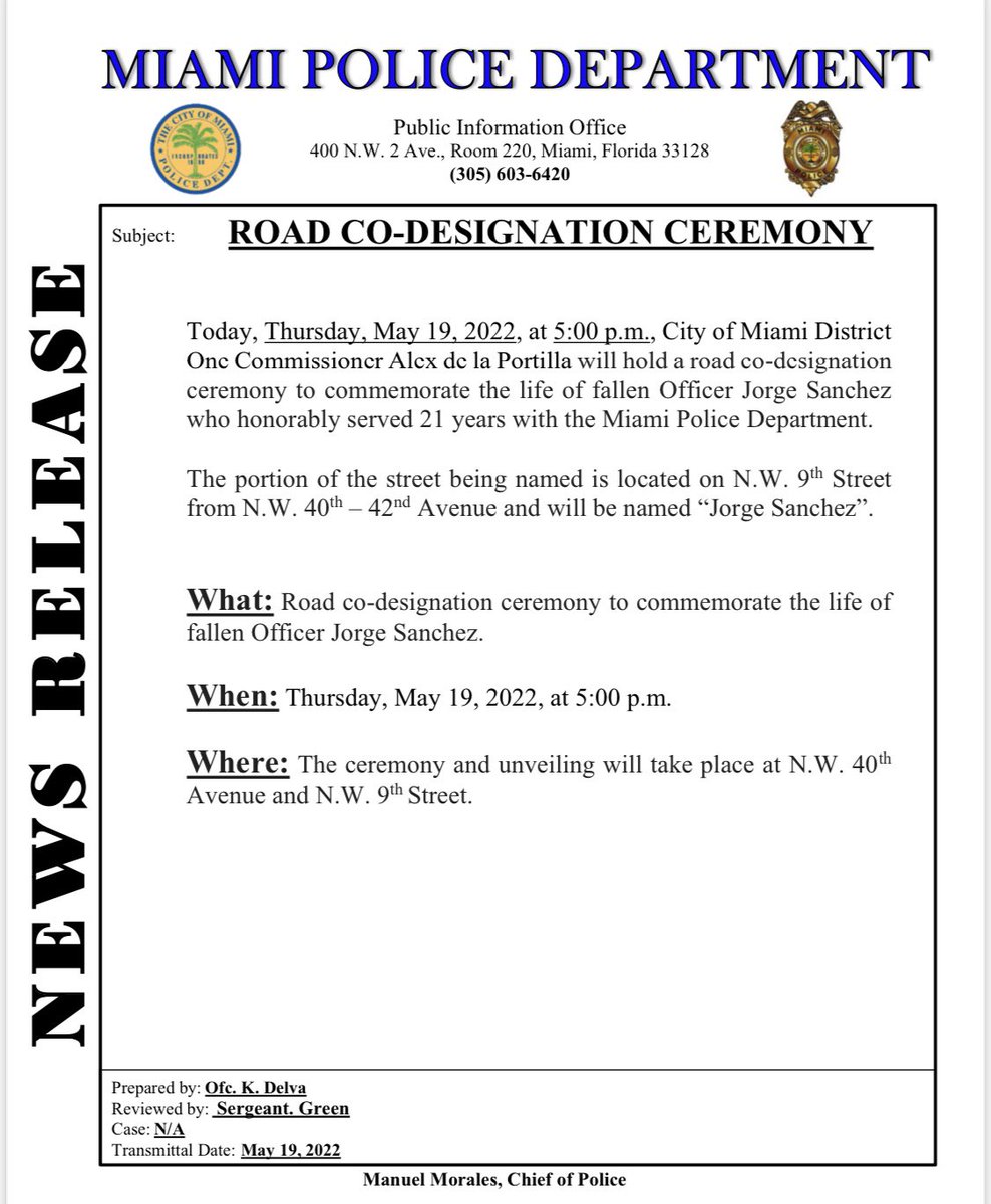 ROAD CO-DESIGNATION CEREMONY Today, City of Miami District 1 Commissioner Alex Diaz de la Portilla held a road co-designation ceremony to commemorate the life of fallen Officer Jorge Sanchez who honorably served 21 years with the Miami Police Dept.https://fb.watch/d6EiekMRN5/