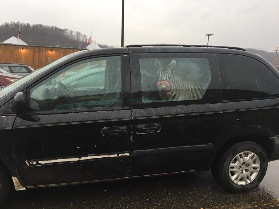 There is a Zebra in a mini van at Texas Roadhouse in Athens