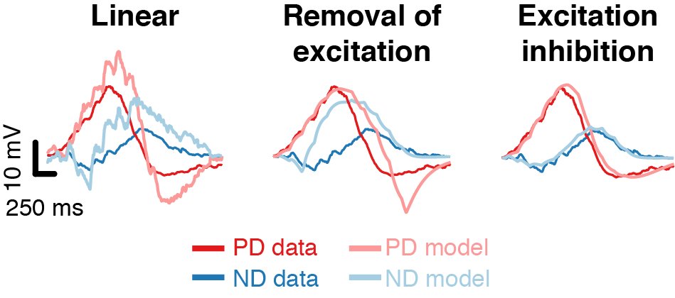 A conductance model using fast excitation and slow trailing inhibition is far superior to either a linear model or a conductance model using the removal of excitation (5/5)pic.twitter.com/bflGYRq6Ib
