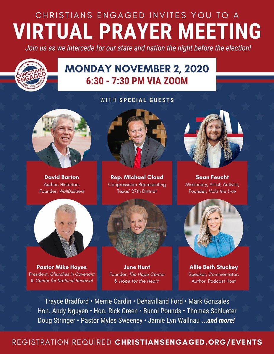 VIRTUAL PRAYER MEETING Monday, 11/2 6:30 pm as we intercede for our nation w/ special guests @DavidBartonWB, Congressman @MichaelJCloud, @seanfeucht, @PastorMHayes, @JuneHuntHope, @conservmillen, CE Leader @bunnipounds & more! #txlege #Texas