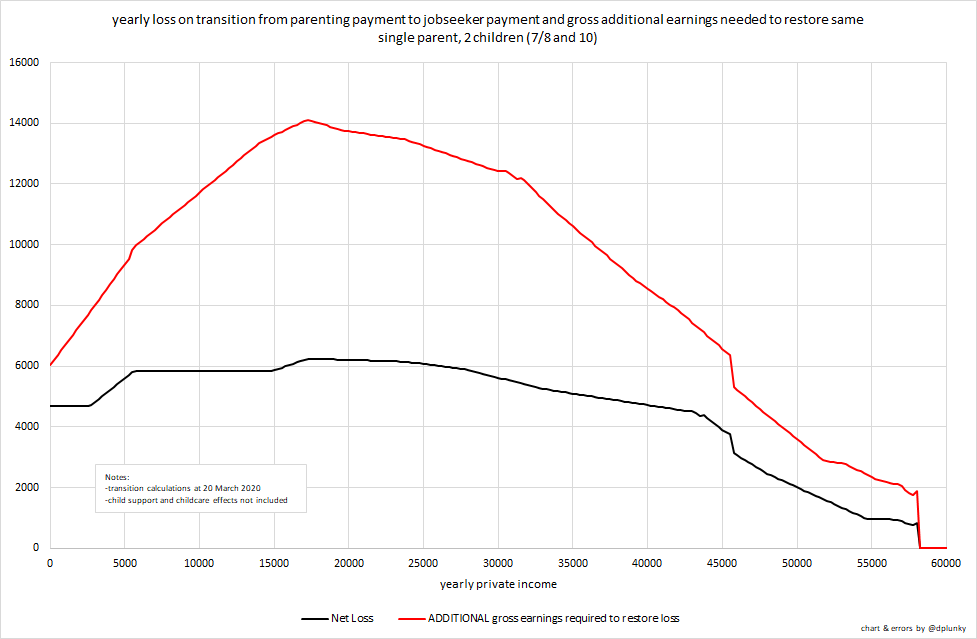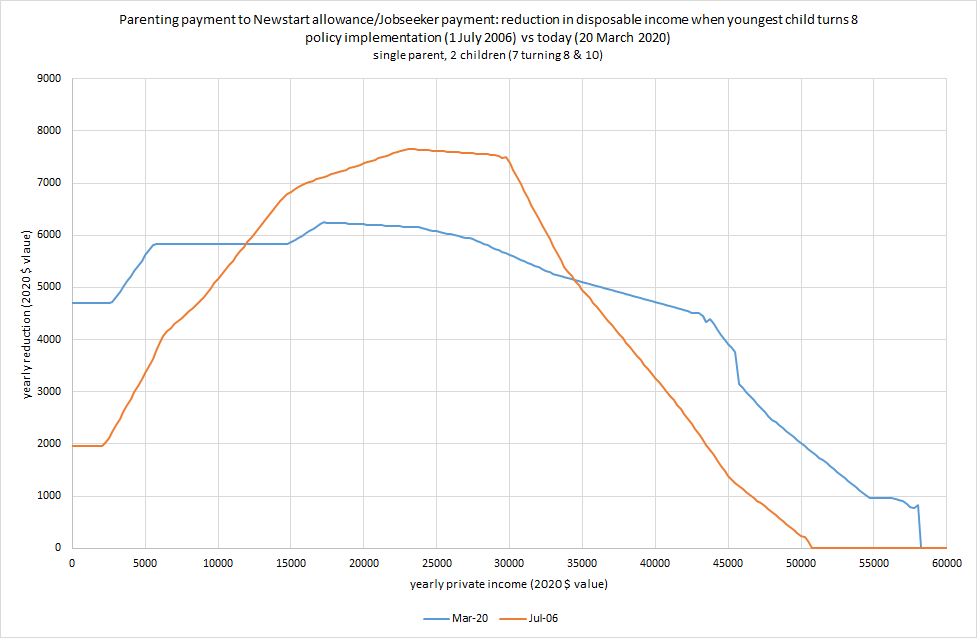 Unless there's something of a wages breakout, single parenting payment rates in March will be based on CPI change. That gives rise to these updated 'losses when child turns 8' charts...