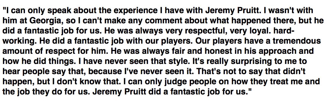 Nick Saban's response when asked about Jeremy Pruitt following comments from Aaron Murray & David Pollack: "He was always very respectful... I have never seen that style. It's really surprising to me to hear people say that, because I've never seen it." Full quote from Saban:pic.twitter.com/Y3uXAukzRI