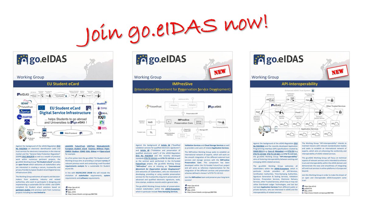 The go.eIDAS-Association proudly announces new Working Groups ("IMPreSSive" (International Movement for Preservation Service Development) and "API-Interoperability") and invites further partners to join this exciting initiative. See https://go.eID.AS/association-welcomes-additional-partners … for more info.