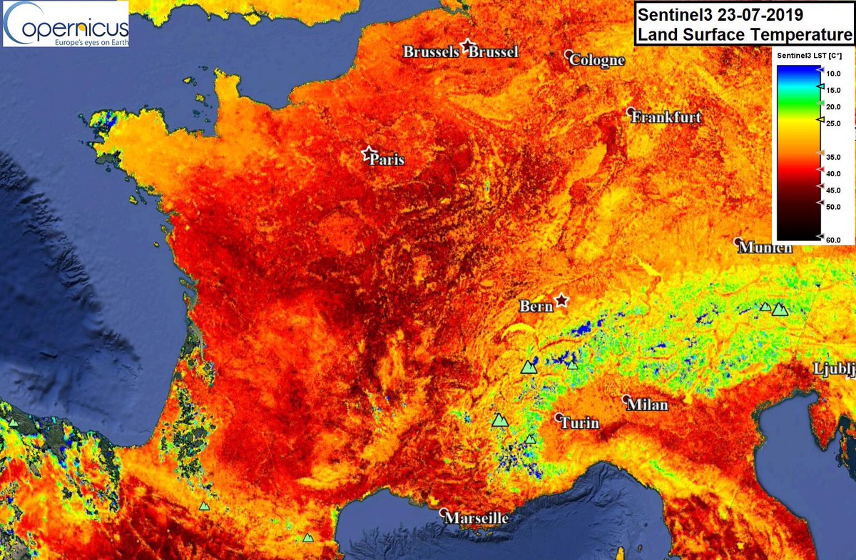 #canicule Land Surface Temperature measured by#Sentinel3 yesterday amidst record-breaking
