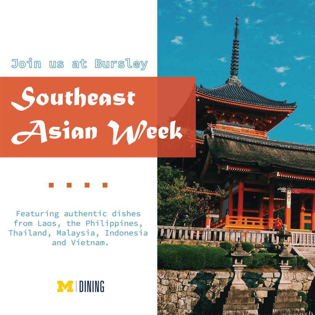 Let's go on a culinary tour of Southeast Asia (no passport needed)! Today through Friday, you can visit the Bursley dining hall to enjoy authentic dishes from Laos, the Philippines, Thailand, Malaysia, Indonesia, and Vietnam. Hope to see you there!pic.twitter.com/hkR1GD9URj