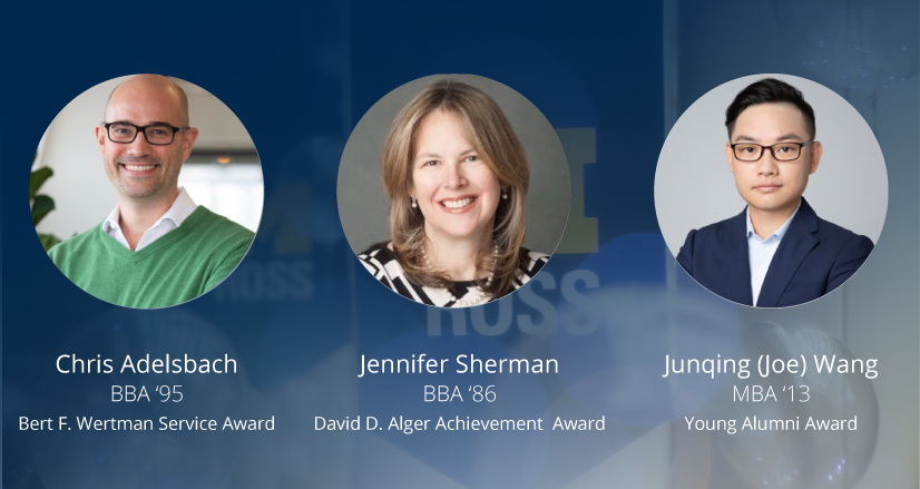 #MichiganRoss Alumni Awards have been announced! Alumni awards recognize the service and impact of extraordinary Ross alumni, and are chosen based on a vote by their peers each fall. Congratulations to all three winners! http://myumi.ch/r8Y88 pic.twitter.com/O5PdBOcoO2