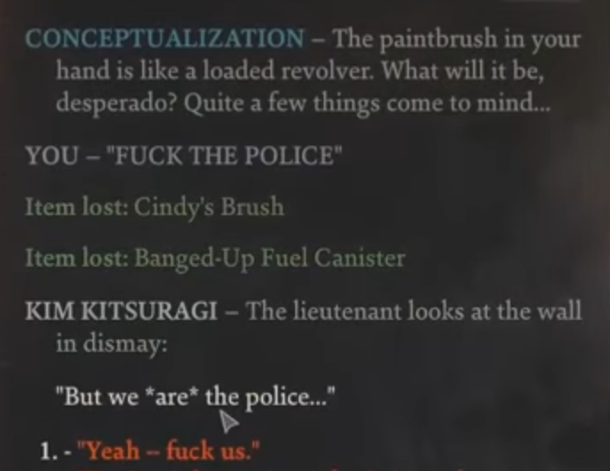 The basic conceit of this game is that you're an alcoholic fuck up of a detective who got so blackout drunk he can't even remember his own name and now has to solve a murder while getting into conversations with parts of his own head.