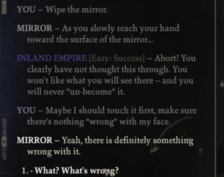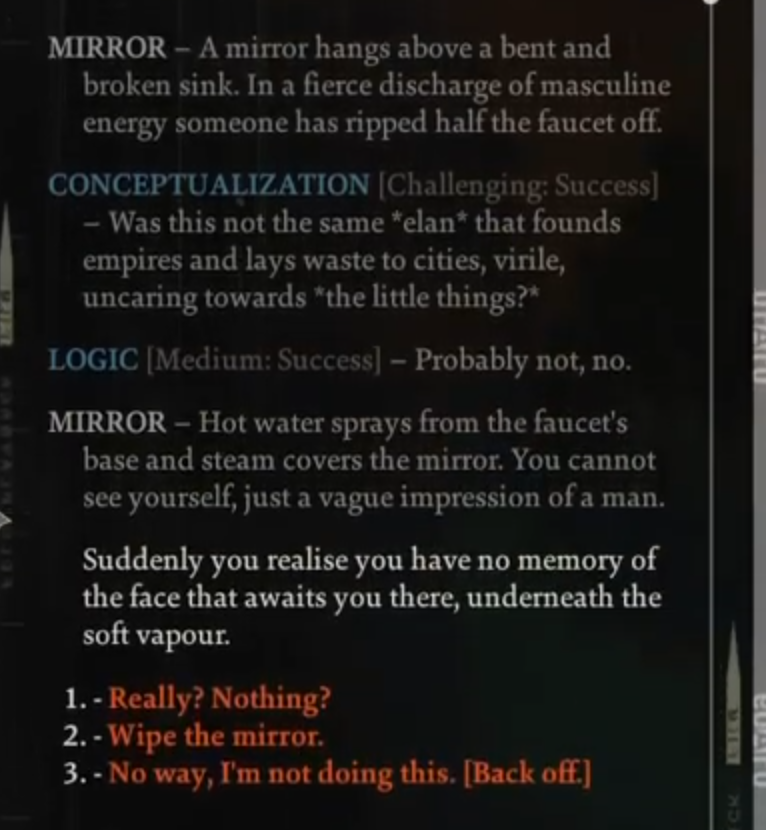 It deals with the amnesia in a very cool way, when you wake up hungover you literally have no conception of your own face, even your character portrait is just a smudgy mess but you can get that fixed by having a moment of introspection in front of a mirror.pic.twitter.com/nmrBNryTwc