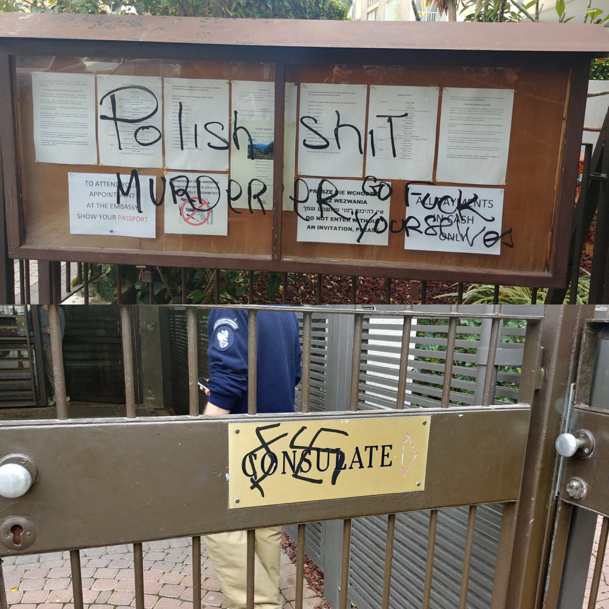 Police units searching for suspects in tel Aviv after graffiti written at entrance of polish embassy today. Investigation continues.pic.twitter.com/iBfng82XUK