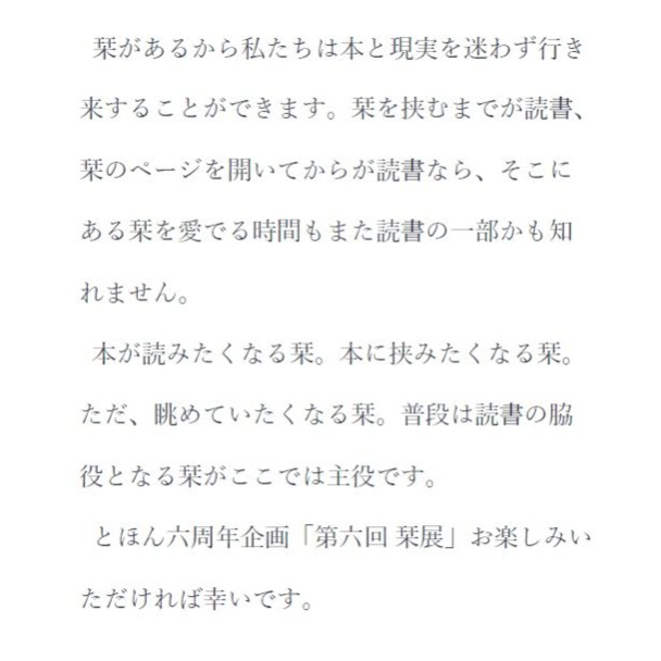 2月6日から開催「第6回栞展」の参加者が35組になりました!受付〆切は1月末です。期日前でも40組になりましたら受付終了いたします。 開催日まで2週間と近づいておりますが、作品の納品(2/5必着)が間に合うようでしたらぜひご検討ください。栞展、どうぞよろしくお願いいたします!https://twitter.com/tohontohon/status/1216969207063048195 …