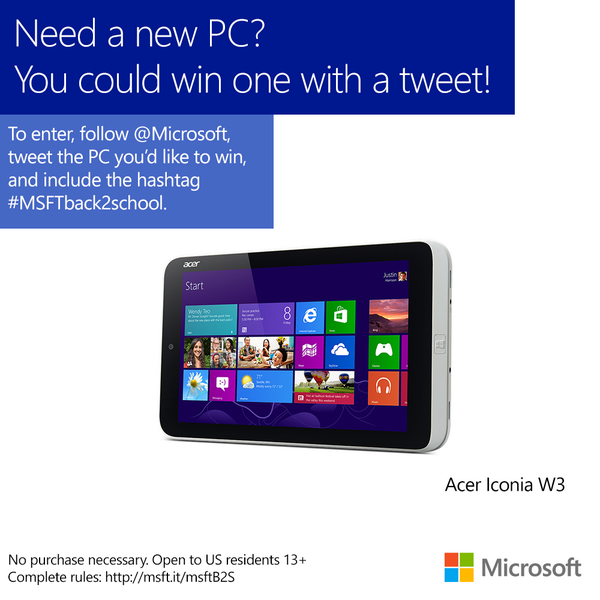 Enter for a chance to win an @Acer Iconia W3 #Windows8 PC in our #MSFTBack2School tweetstakes! (US/13+)pic.twitter.com/I5XAnWmB1y