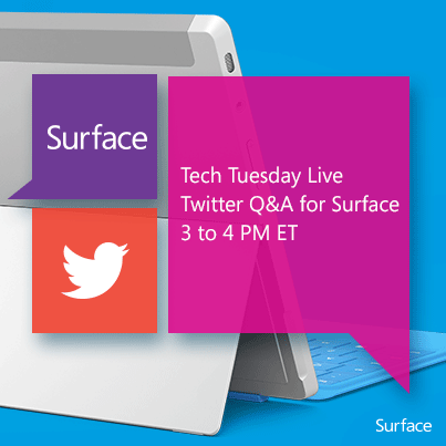 @Microsoft: Starting in 5 minutes: Join@surface for a Tech Tuesday#WinChat!pic.twitter.com/s3CWMPte4F