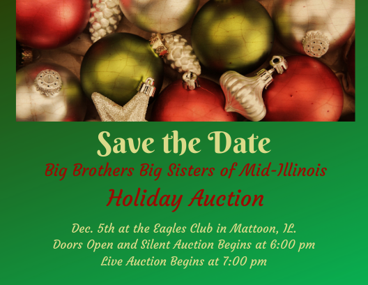 Mark your calendars! BBBS of Mid-Illinois is hosting their annual Holiday Auction, Dec. 5th! See you there!pic.twitter.com/m0IoMHqLu0