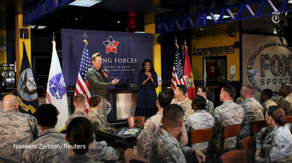 Michelle Obama, with Conan O’Brien, visits troops in Qatar http://nyti.ms/1MxLwwe pic.twitter.com/lo0NBsQWBd