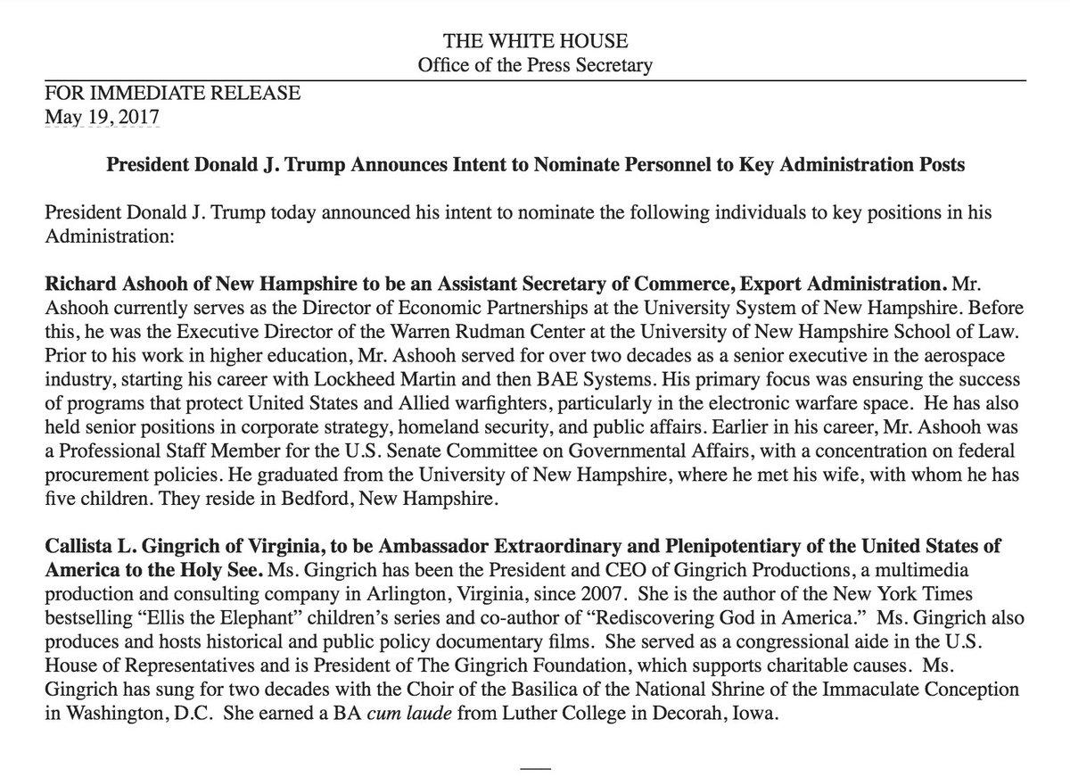 Trump nominates Callista Gingrich as U.S. Ambassador to the Vatican pic.twitter.com/fS6QHDWSiZ