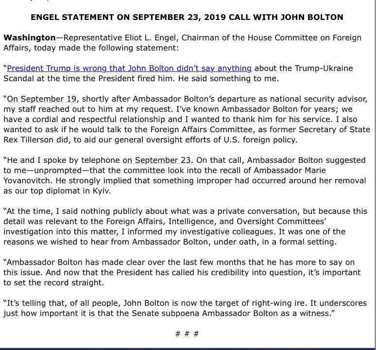 Foreign Affairs Chair Eliot Engel says Bolton told him to look into Marie Yovanovitch's firingpic.twitter.com/hqCvRJK19w