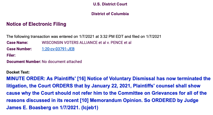 DC federal judge James Boasberg will consider initiating sanctions process against lawyers who brought election case Wisconsin Voters Alliance v Pence. Order just issued: