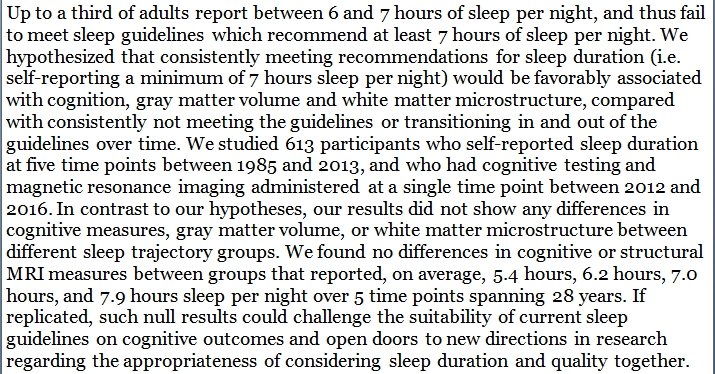 Wow. Longitudinal study reports that sleeping <7h/night over three decades showed no association with participants' brain structure or cognitive performance compared to >7h/night (self-reported). n=613 Now check obesity, diabetes, heart disease, substance use, and mortality.https://twitter.com/DegenRolf/status/1215491268870131713 …