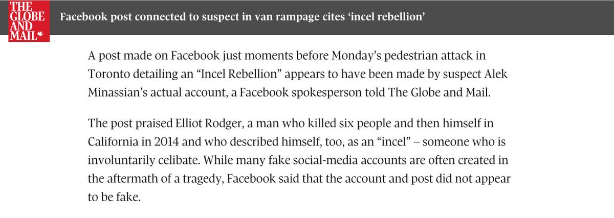 #Toronto's @globeandmail confirned from Meg Sinclair of #Facebook #Canada in an e-mail confirming #Minassian's last FB post was his account. It spoke of the Involuntary celebrate rebellion - a virtual term used by digital reality 'rebels' who fail in real-world relationshipspic.twitter.com/VhjUcr3Ju0