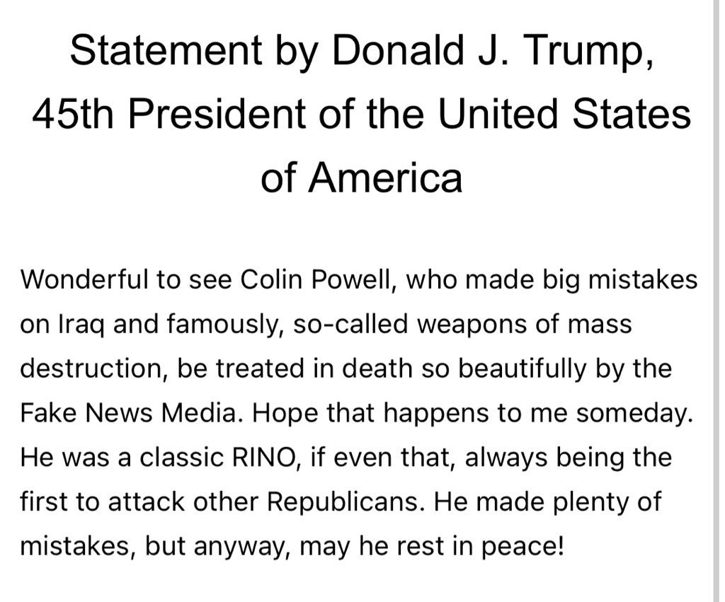 @GlennYoungkin, care to comment on Trump & Virginia’s own, Colin Powell? TRUMP: Wonderful to see Colin Powell, who made big mistakes on Iraq and famously, so-called weapons of mass destruction, be treated in death so beautifully… Hope that happens to me someday.pic.twitter.com/fBb3bjtnto