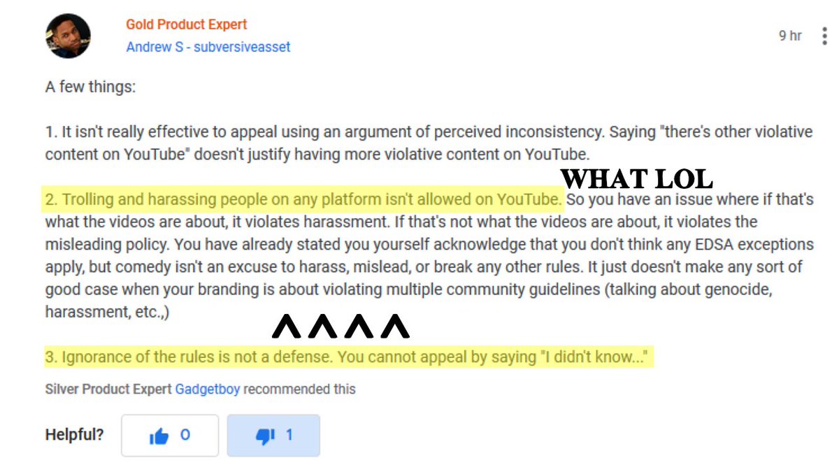YT Flagger - "100k users can escalate their strikes". Being called a "stupid retard" then being told not to put retard in my videos. YT Contributor - "Trolling isn't allowed on YouTube" "...volunteers who spend their free time for you little creators.." This is YT support