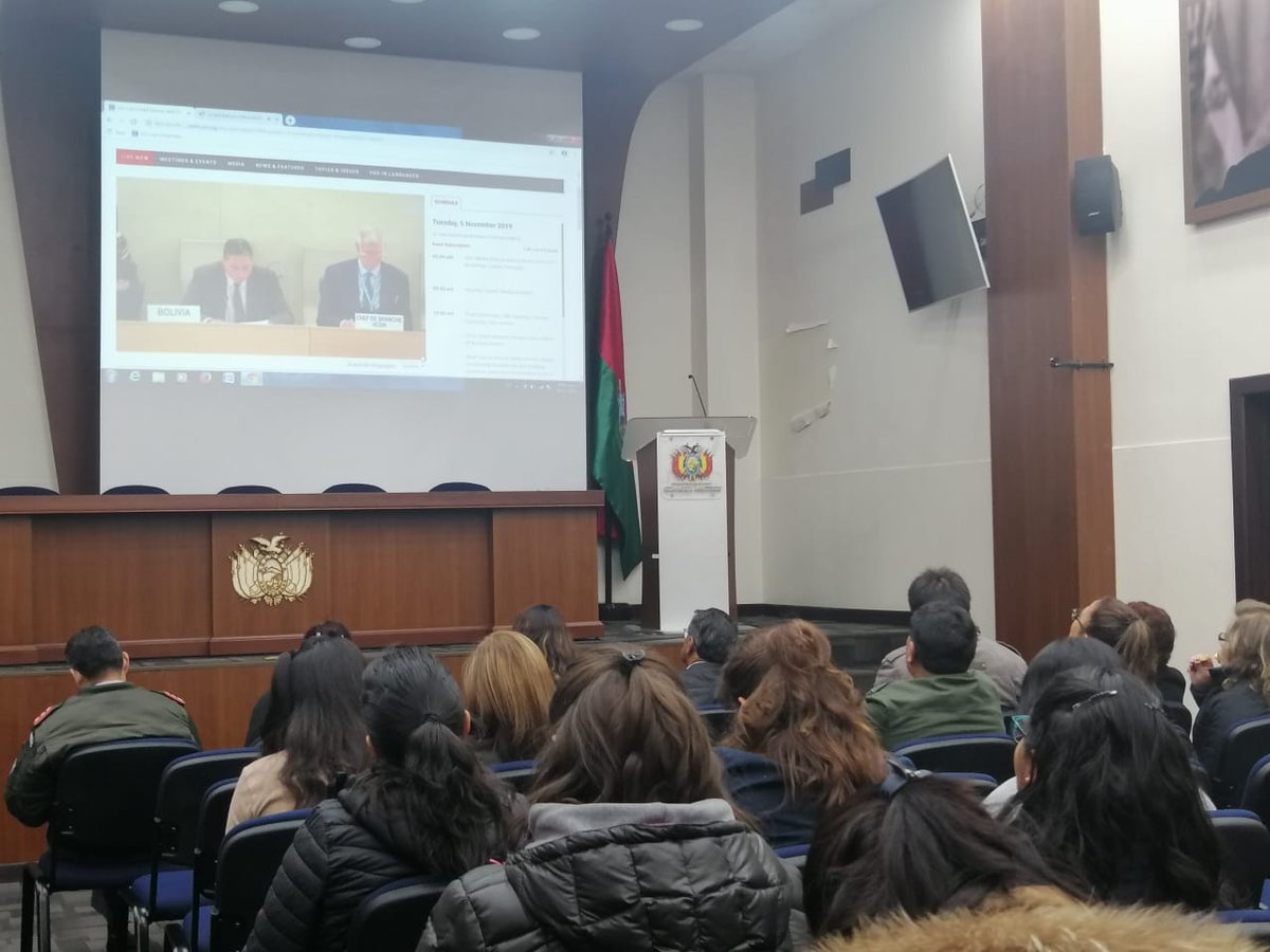 #EPU Servidor@s del@MinJusticiaBol asisten remotamente la rendición del#EPU que realiza el Estado
