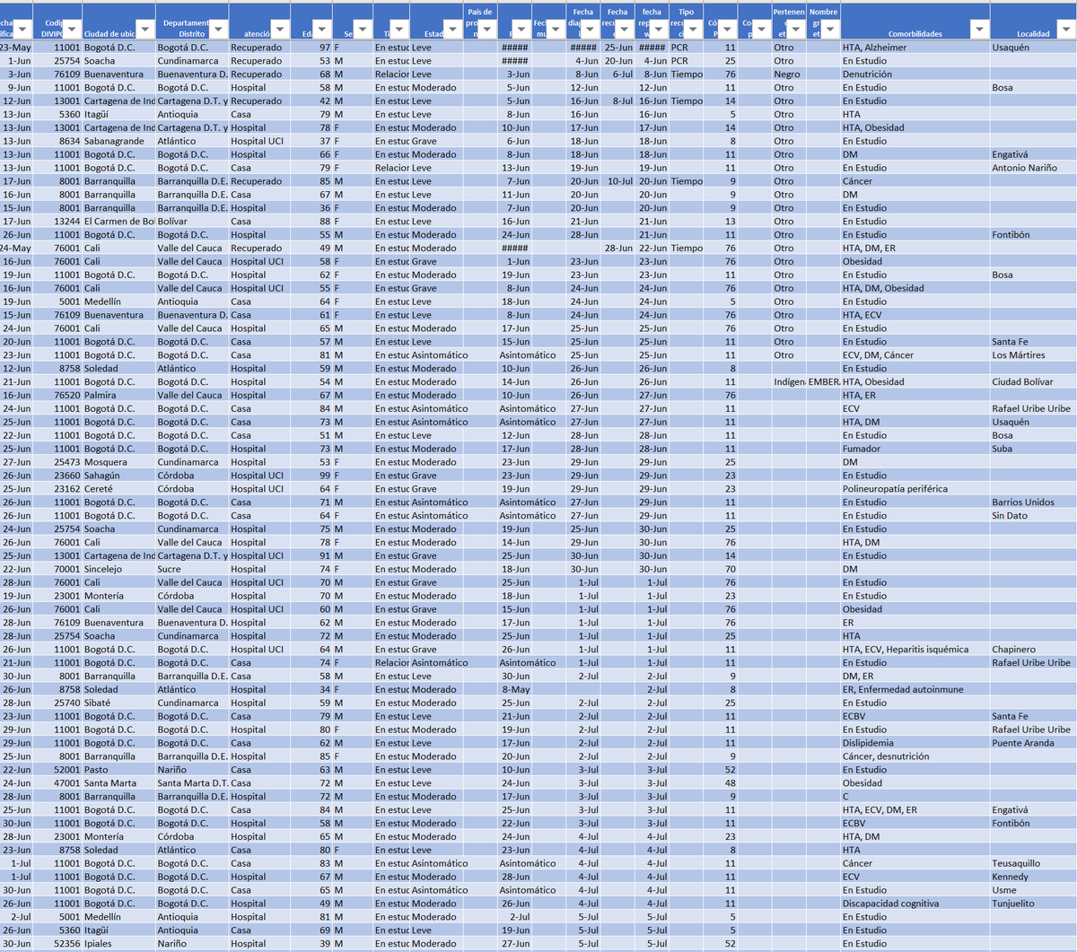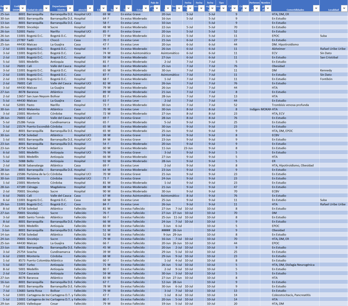 En lo que va de pandemia, el día anterior los fallecidos estaban: Fecha: 11-Jul Casa 1212 Hospital 1938 UCI 893 Recuperado 80 Fallecido 996 TOTAL 5119 Fuente: https://www.ins.gov.co/Paginas/Boletines-casos-COVID-19-Colombia.aspx …pic.twitter.com/ReMepJLuZ3