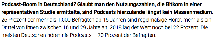 Ich mag keine Podcasts. Ich finde es aber auch albern, bei 1.224 Teilnehmern von einer repräsentativen Umfrage zu sprechen. Ich weiß, das hat sich irgendwer mal irgendwann so ausgedacht, aber... Nein.