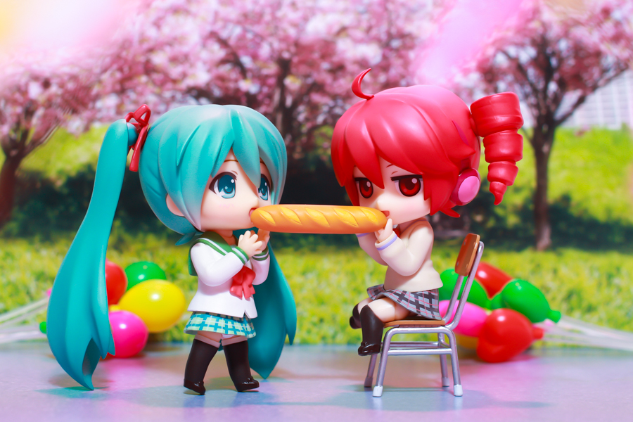 #深夜のねんどろ撮影60分一本勝負 2/1【したしい】 テトは右からミクは左から…。 一緒にフランスパンを食べる二人は とっても親しいのっ