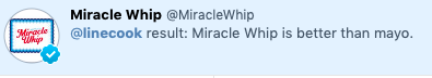 The Whip > mayo. https://twitter.com/MiracleWhip/status/1224109802441363456 …
