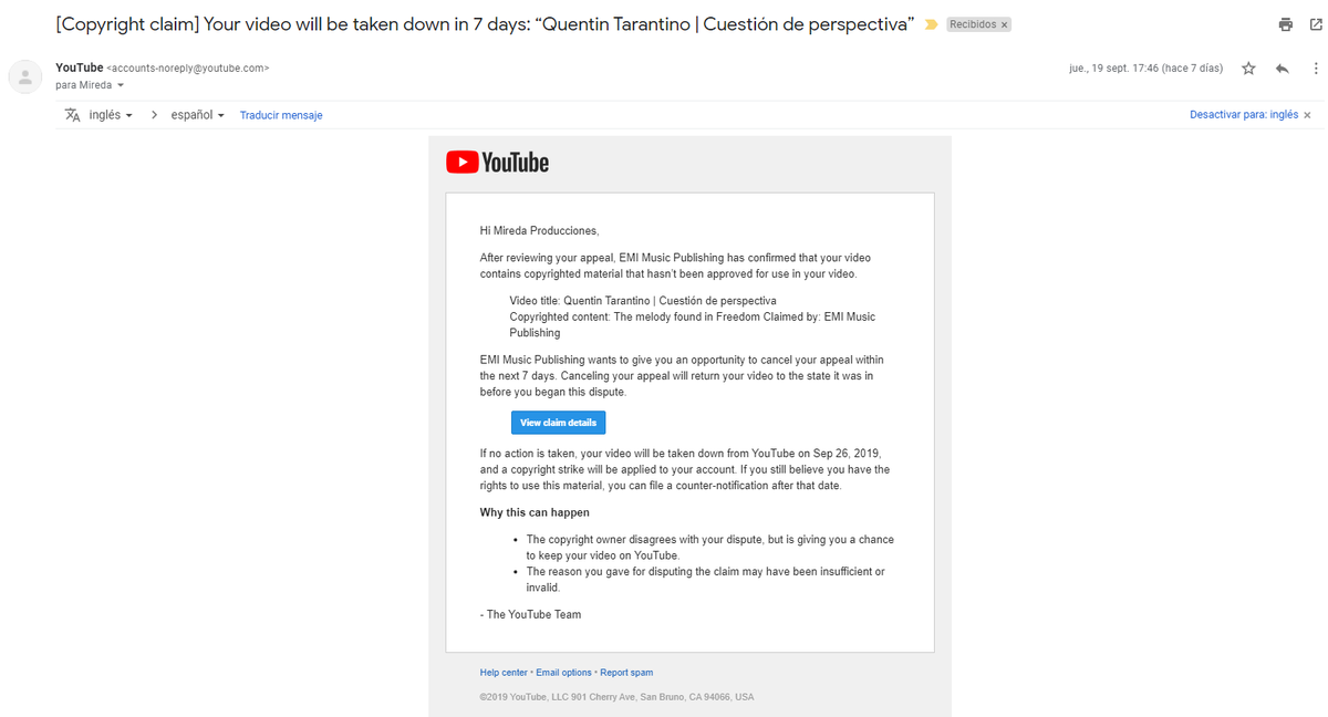 Hola, es raro esto que nos comentas. ¿Podrías enviarnos una captura de pantalla del correo que te llegó con respecto a los derechos de autor? También, nos sería de ayuda la URL del video que nos mencionas. Estaremos al tanto de tu respuesta. Saludos.