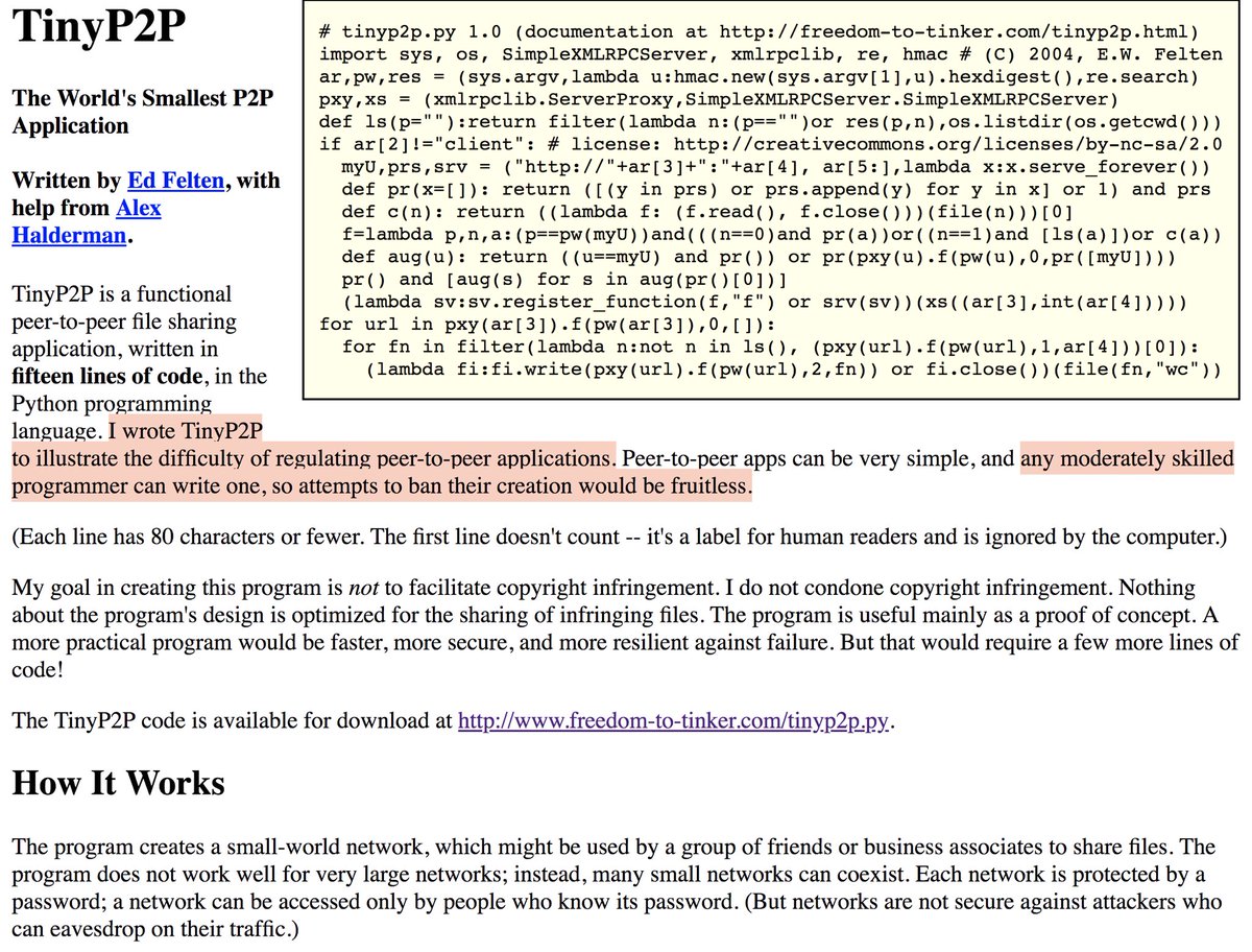TinyP2P—A functional p2p file sharing application in 15 lines of Python (2004) > I wrote TinyP2P to illustrate the difficulty of regulating peer-to-peer applications … attempts to ban their creation would be fruitless Annotated source: https://git.io/fNsxs pic.twitter.com/6uXyTqavxx