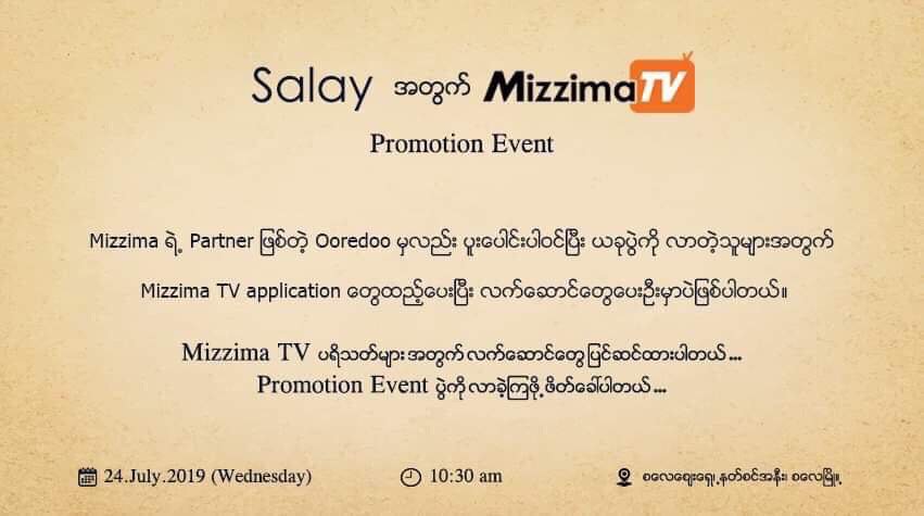 Salay အတြက္ Mizzima TV (Promotion Event) Mizzima ရဲ႕ Partner ျဖစ္တဲ့ Ooredoo မွလည္း ပူးေပါင္းပါဝင္ၿပီး ယခုပြဲကုိ လာတဲ့သူမ်ားအတြက္ Mizzima TV application ေတြ ထည့္ေပးၿပီး လက္ေဆာင္ေတြေပးဦးမွာပဲျဖစ္ပါတယ္။ Mizzima TV ပရိသတ္မ်ားအတြက္ လက္ေဆာင္ေတြ ျပင္ဆင္ထားပါတယ္ ...pic.twitter.com/rLI9oCm9Xh