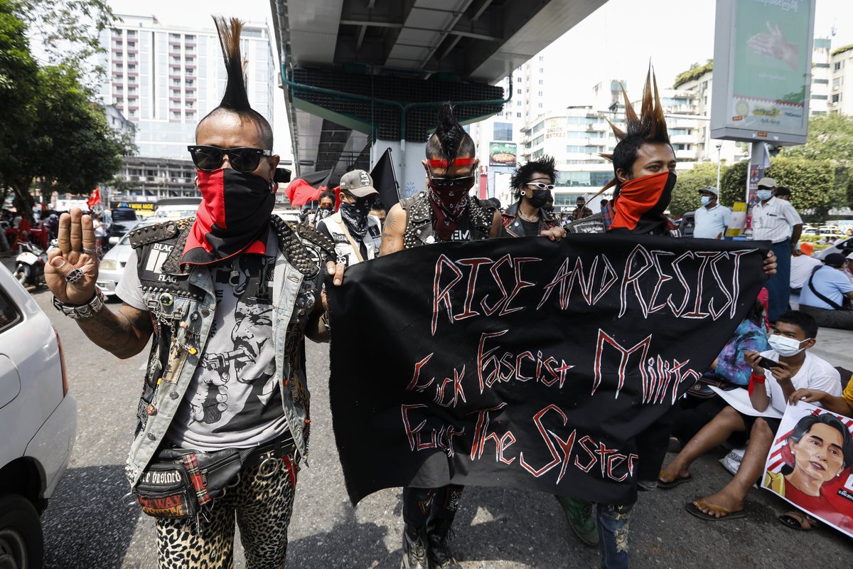 Protesters from #punk community hold a banner and flash the three-finger salute as they march during a protest against the #militarycoup in #Yangon, #Myanmar, 19 February 2021. EPA-EFE/NYEIN CHAN NAINGpic.twitter.com/kl4FEpQzZg