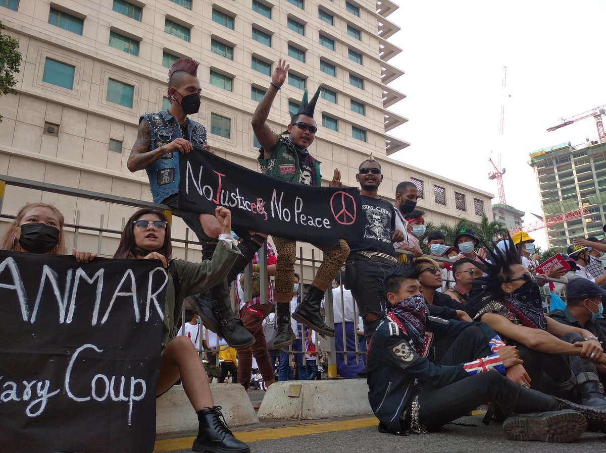 ၂၂၂၂၂ မြန်မာ့နွေဦးတော်လှန်ရေးနေ့မှာ ရန်ကုန်က ပန့်ခ်အဆိုတော် နဲ့ ပန့်ချစ်သူတွေလည်း ဆူးလေလမ်းပေါ်မှာ "တရားမျှတမှုမရှိရင်၊ ငြိမ်းချမ်းမှုမရှိ" "No Justice, No Peace" ဆိုတဲ့ဆောင်ပုဒ်ကို သံပြိုင်ဆိုရင်း ဆန္ဒပြခဲ့ကြပါတယ်။pic.twitter.com/lSbq3ecuNK