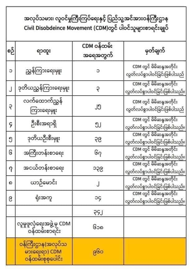 ဘာလို့ လဝက ဝန်ကြီးဌာနလို့ပဲ ရေးနေကြတာလဲမသိဘူးနော်.... တကယ် CDM လုပ်နေတာက အလုပ်သမားဦးစီးဌာနတွေကပါ...လဝက ကဖြင့် ခုံပျောက်မှာမို့ ဖင်တောင် မကြွပဲနဲ့ ..