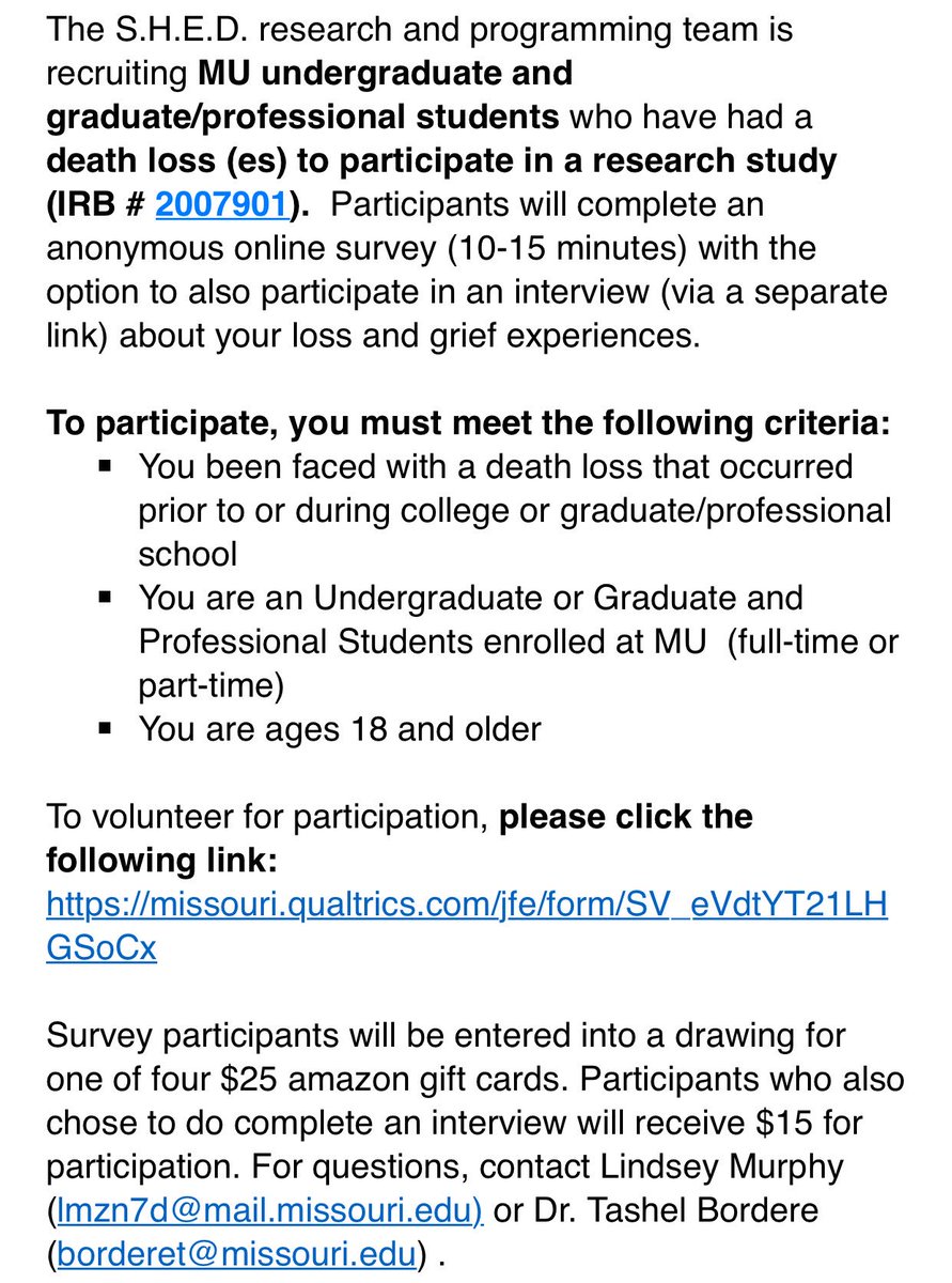 https://missouri.qualtrics.com/jfe/form/SV_eVdtYT21LHGSoCx … here is the link for the survey! Complete by June 20th if you have experienced loss and are currently an MU student!https://twitter.com/mizzoulbc/status/876237141243777024 …