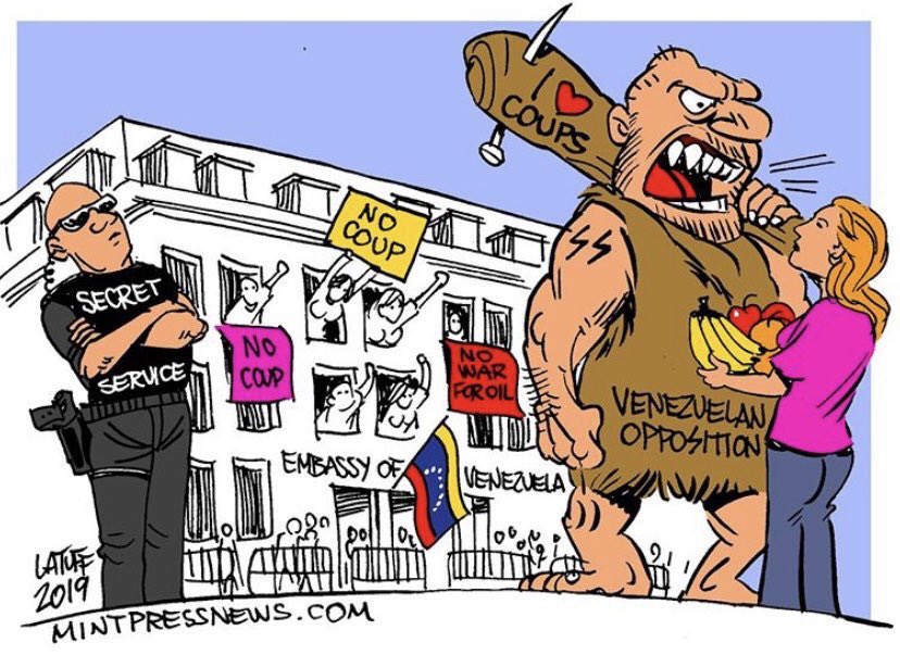 #Venezuela embassy in Washington DC is under siege by truculent, troglodite-like, pro-US coup Venezuelan opposition thugs, with the benevolence of Secret Service agents. These bullies try to prevent food to reach the activists inside the embassy. Cartoon@MintPressNewspic.twitter.com/1dZUtMVr3N
