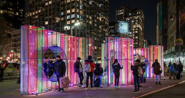 #MoMath celebrated the#WinterSolstice on the Flatiron Public Plaza! The#Museum welcomed New Yorkers, tourists, and math enthusiasts to take “mathematical#selfies” using our giant#kaleidoscopes that reveal geometric reflections hidden in every human face!pic.twitter.com/Gfisf70uXa