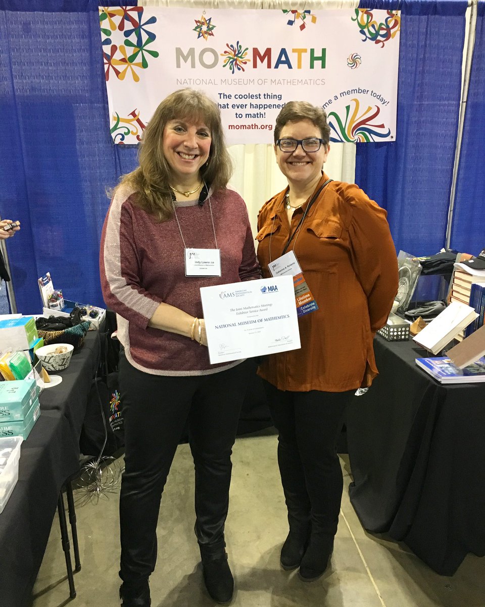 #MoMath, Cindy Lawrence, accepts a certificate from the Executive Director of the#AmericanMathematicalSociety, Catherine Roberts, for MoMath’s 10 year participation in the Joint Mathematics Meeting (the largest#mathematics meeting in the world)!#jmm2020#math#educationpic.twitter.com/3n1ao8QVHm