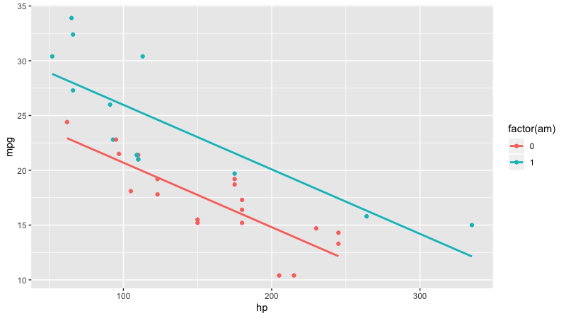 #ggplot2 geom layer (many intercepts, common slope) library(tidyverse) library(moderndive) ggplot(mtcars, aes(x = hp, y = mpg, col = factor(am))) + geom_point() + geom_parallel_slopes(se = FALSE)pic.twitter.com/TP2RZoXbOL