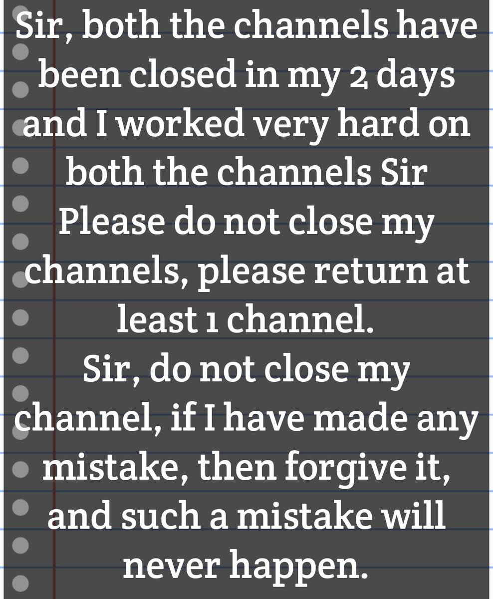 @TeamYouTube Hello Sir, do not close my channel, if I have made any mistake, then forgive it, and such a mistake will never happen. channel URL http://youtube.com/c/MSStatusMs  second channel URL http://youtube.com/c/MoinuddinMoinuddin …pic.twitter.com/b3PS2BbFJp