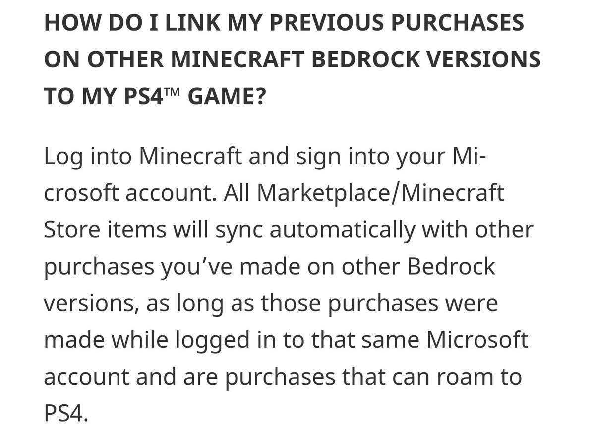 @MojangSupport I have loads of purchases from the Minecraft store in bedrock from xbox, switch, and android. Should they not be syncing onto PS4 as well? I've connected the same Microsoft account to it
