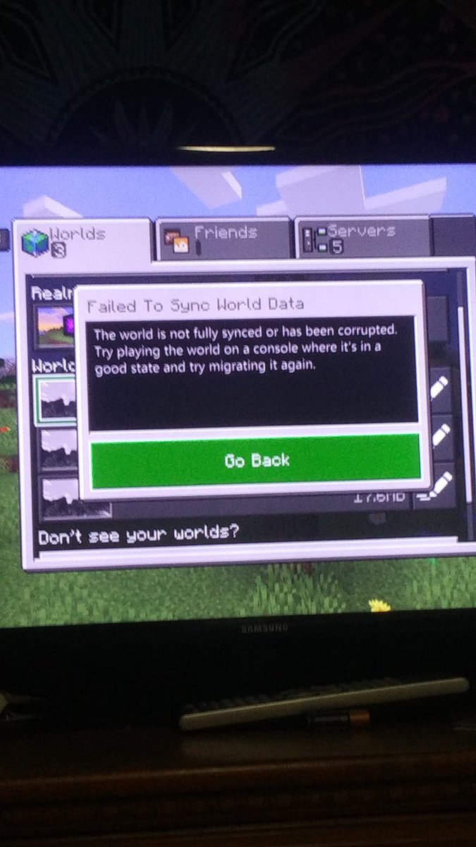 @MojangSupport please help, a while ago when trying to play on my minecraft world on Xbox one I get a error message saying "Failed to sync world data: The world is not fully synced or has been corrupted. Try playing the world on a console where it's in a good state and try migra-pic.twitter.com/F7eTA9oRkr