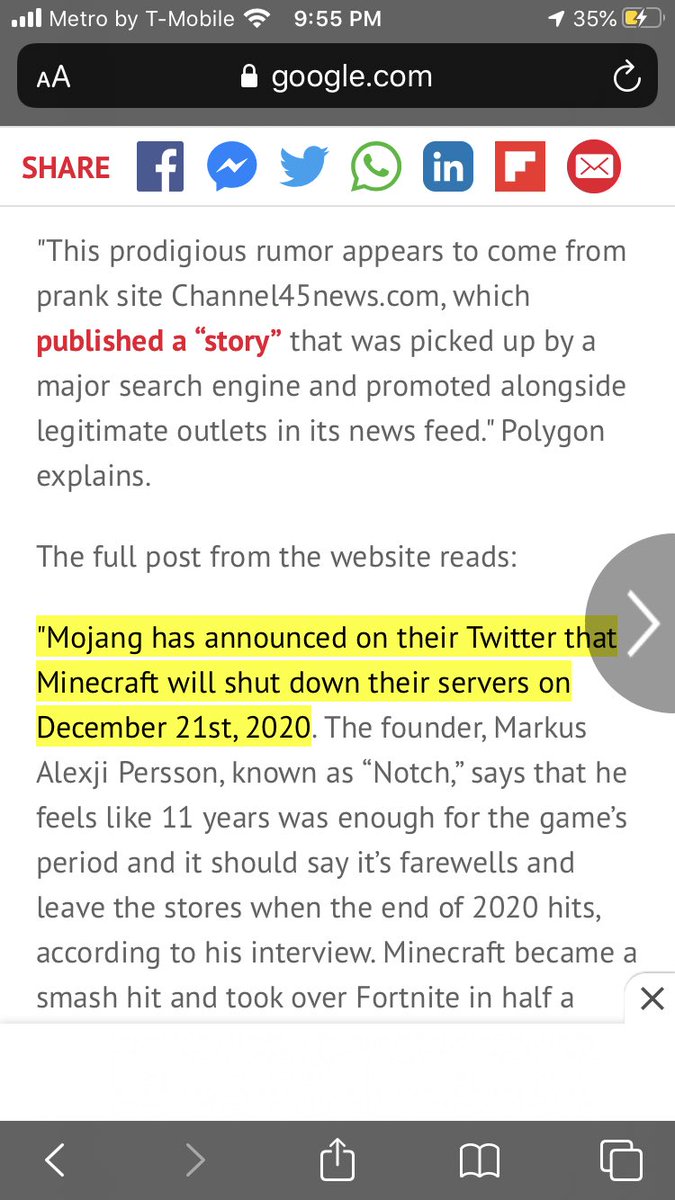 Hey folks, I can confirm that Minecraft servers are NOT shutting down in 2020. It’s just a stupid hoax. Feel free to pass this along. pic.twitter.com/uHIqWOMsTR
