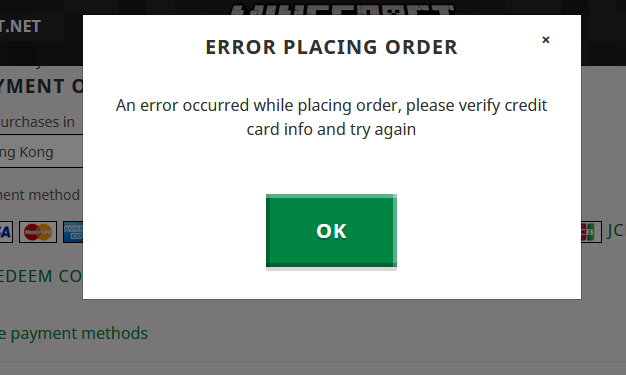 @MojangSupport Hi Mojang Support, I am having a problem with purchasing minecraft Java edition. I tried both visa credit card and paypal but they show this error, switching browsers didn't work, also amazon won't even let me buy a code (anything to do with me living in HongKong?)pic.twitter.com/2MHqOGM4cm