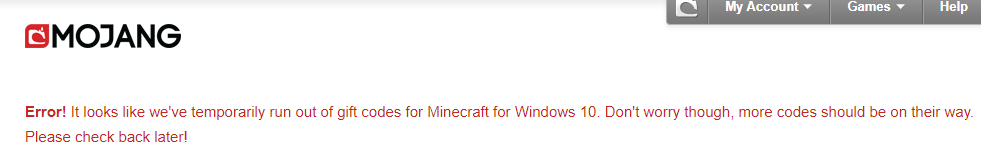@MojangSupport still getting an issue Claiming Minecraft for Windows 10, "Error! It looks like we've temporarily run out of gift codes for Minecraft for Windows 10. Don't worry though, more codes should be on their way. Please check back later!"pic.twitter.com/Jn0ve0QSek